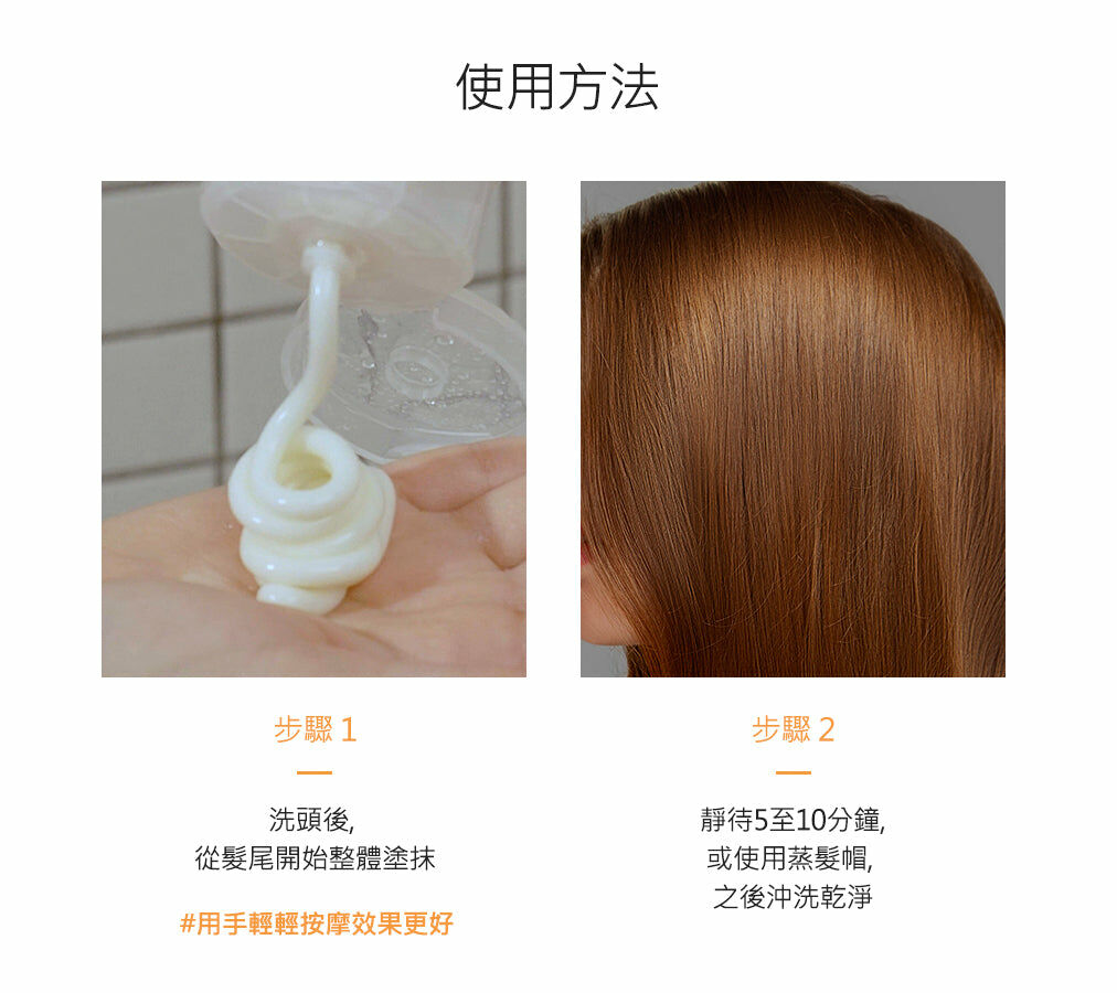- 洗頭後, 從髮尾開始整體塗抹,靜待5至10分鐘,或使用蒸髮帽, 之後沖洗乾淨