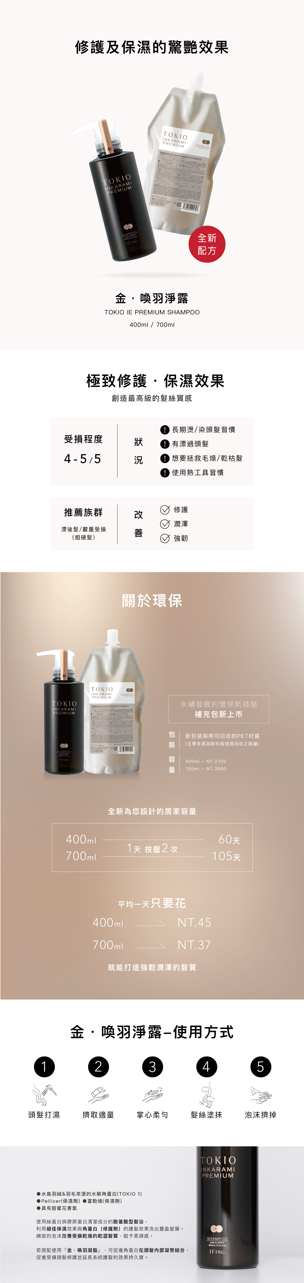 • - 具優秀護髮效果的配方成份,搭配獨家配方「外部凝聚結合成分」,可以有效將角蛋白滲透進毛髮內部結合,打造出極致修護能力的洗髮精與護髮產品。